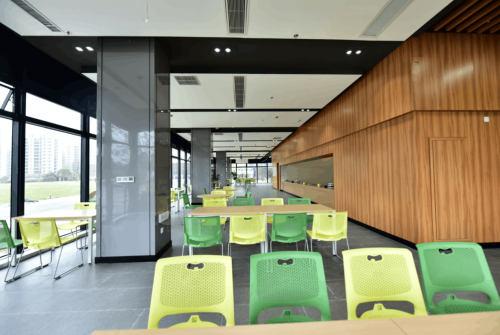 正對(duì)著室外操場(chǎng)的小學(xué)部食堂窗明幾凈,采用三層樓的設(shè)計(jì),每層樓都裝配了大面積的落地窗,讓孩子們?cè)诰筒偷耐瑫r(shí)盡情沐浴陽(yáng)光。