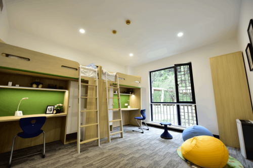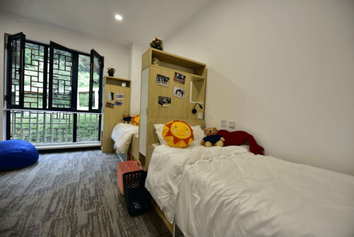 有所不同的是,杭州威雅并沒有所謂“宿管阿姨”的概念,因?yàn)榕c孩子們同吃同住的,都是教育工作者,是學(xué)校里的老師和舍監(jiān)。每幢宿舍樓都是一個(gè)學(xué)院,老師們將在每一個(gè)清晨把孩子們從睡夢(mèng)中溫柔地喚醒,又在結(jié)束了一天的學(xué)習(xí)與活動(dòng)后,與孩子們一起回到宿舍樓休憩。