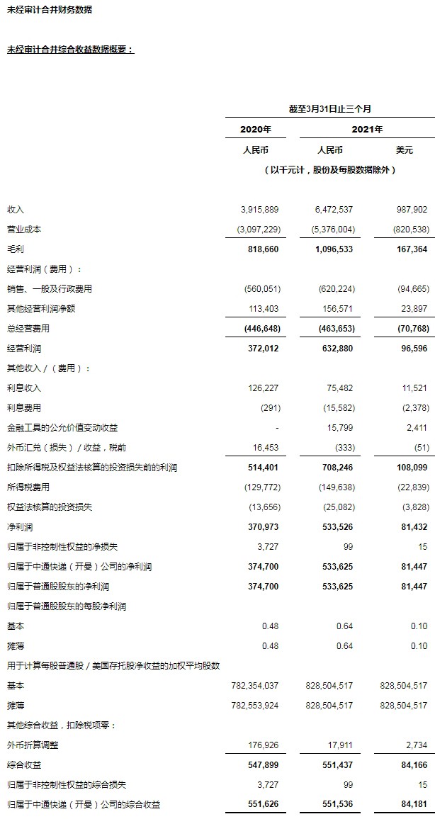 中通發(fā)布2021年第一季度未經(jīng)審計財務(wù)業(yè)績