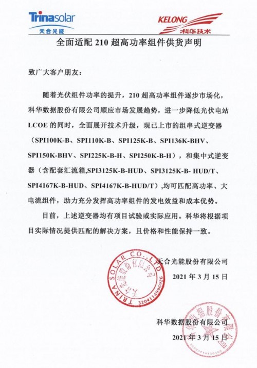 在光伏領(lǐng)域,科華光伏逆變器解決方案以高可靠、高性能、高適配的特點(diǎn)以及核島級(jí)品質(zhì),打造了一系列標(biāo)桿項(xiàng)目,積累了全球累計(jì)裝機(jī)量13GW。近日,公司正式宣布旗下逆變器產(chǎn)品全面適配210組件且可批量出貨,成為當(dāng)前大電流逆變器產(chǎn)品線最全的企業(yè)之一。