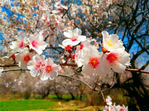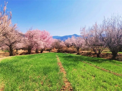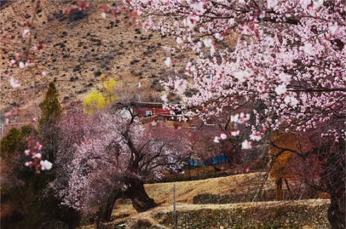太陽谷漫山遍野的桃花,由一朵兩朵為訊,接著一樹又一樹,鋪滿山坡,蔓延河谷,形成浪漫花海。白色的藏房,青青的麥田,雪域的藍(lán)天,耕作的農(nóng)民伯伯,還有古老的村落都淹沒在這花海里,構(gòu)成了一幅幅和諧的田園畫卷。