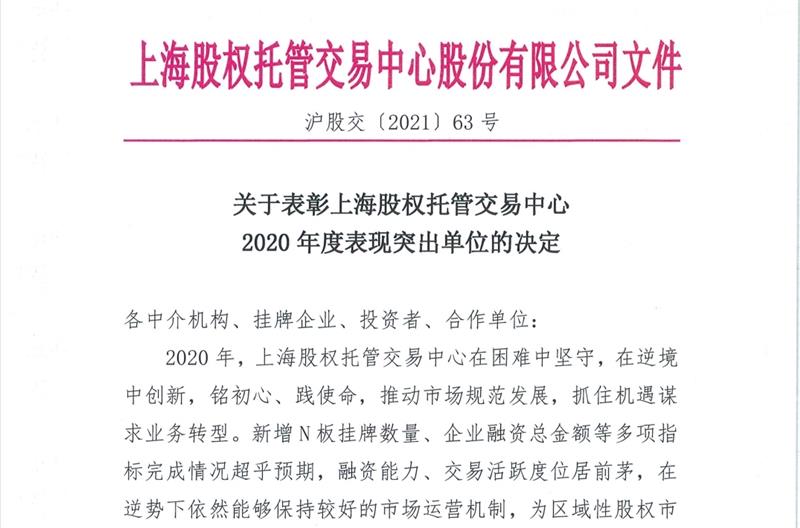為更進(jìn)一步激發(fā)市場(chǎng)參與主體積極投身建設(shè)上海國(guó)際金融中心和科創(chuàng)中心的偉大事業(yè),近日,上海股權(quán)托管交易中心決定對(duì)139家次2020年對(duì)市場(chǎng)發(fā)展做出突出貢獻(xiàn)的掛牌企業(yè)、投資者、中介機(jī)構(gòu)及合作單位予以嘉獎(jiǎng)。上海邁童文化科技股份有限公司和董事長(zhǎng)黃芳女士榮譽(yù)上榜。