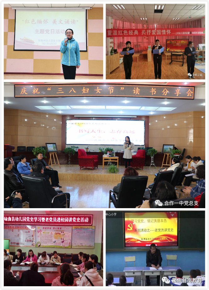 甘南州幼兒園、卓尼縣上河幼兒園以組織生活為抓手組織開展了“美文誦讀、詩歌朗誦”主題黨日活動。老師們用激昂的文字,聲情并茂地朗誦紅色經(jīng)典美文,緬懷革命先烈,謳歌黨的豐功偉績,詮釋了愛國情懷。合作一中為營造良好的讀書氛圍,增強教師文化底蘊,組織開展了“書寫人生,志存高遠(yuǎn)”—慶祝“三八”婦女節(jié)讀書分享會,讓廣大師生在讀書活動中沐浴文化的恩澤,享受閱讀的快樂,樹立文化自信。臨潭縣術(shù)布中心小學(xué)、碌曲縣幼兒園邀請老黨員為學(xué)校師生開展老黨員講黨史活動。邀請老黨員用通俗易懂的話語,為師生們講解了中國共產(chǎn)黨100年的奮斗史,讓少年兒童了解了中國共產(chǎn)黨走過100周年的光輝歷史,讓他們從小知道,今天的幸福生活都是革命先烈用鮮血和血汗換來的,進(jìn)一步培養(yǎng)了他們的愛黨、愛國情懷。