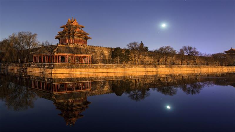 ↑這是北京市天文愛好者戴建峰2016年12月5日在故宮角樓拍攝的“火星合月”照片。(戴建峰本人供圖)