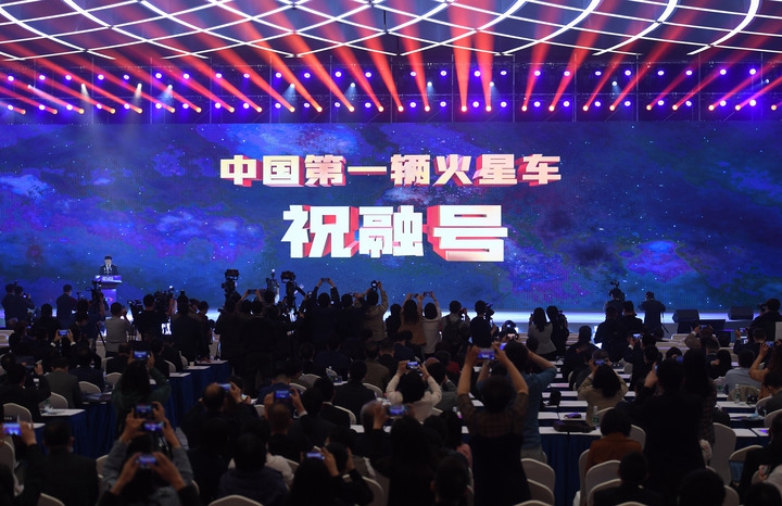 ↑2021年4月24日,國家航天局在江蘇南京中國航天日主場活動(dòng)現(xiàn)場正式宣布:中國第一輛火星車名稱為“祝融”。(新華社發(fā))