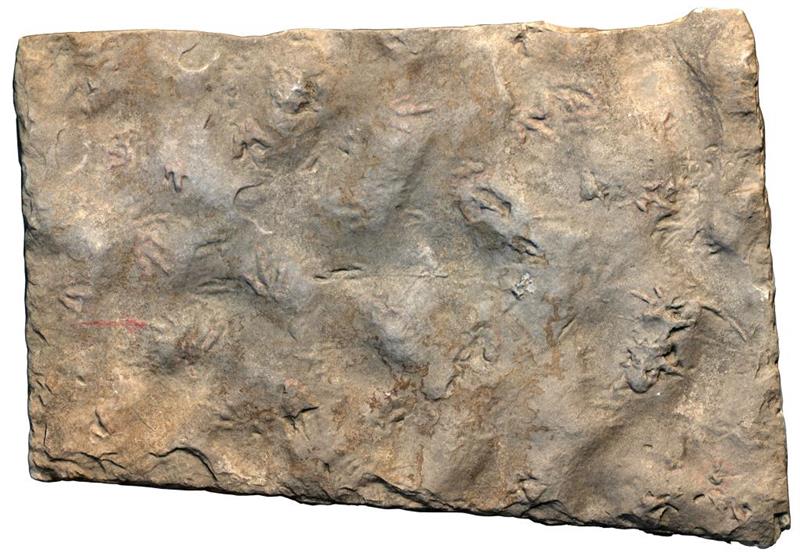 古生物學(xué)家認(rèn)為,同一塊巖板上連同這個足跡一起被發(fā)現(xiàn)的40多個三趾型足跡都屬于蹺腳龍足跡類,蹺腳龍足跡常見的尺寸小于15厘米。