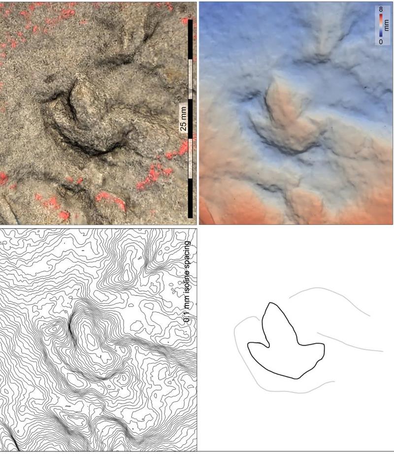 與絕大多數(shù)微小型獸腳類恐龍的足跡一樣,這一足跡究竟來自剛出生的小恐龍還是成年的小型恐龍仍然沒有定論。但古生物學(xué)家傾向認(rèn)為這個微小足跡是由剛出生不久的小恐龍留下的,造跡者體長估計約為12厘米,大致相當(dāng)于現(xiàn)代麻雀的大小。巖板上保存了一系列大小不一、但形態(tài)相對一致的足跡,他們認(rèn)為這可能代表了不同發(fā)育階段小型獸腳類恐龍的足跡集合。