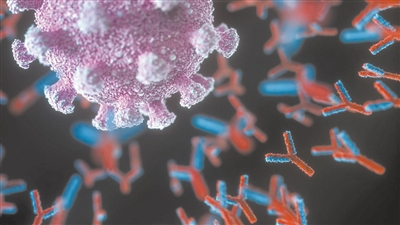 藝術(shù)家描繪的單克隆抗體(紅色和藍(lán)色)攻擊新冠病毒(紫色)的概念圖。