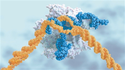 來自CRISPR注射的引導(dǎo)RNA(藍(lán)色)將DNA切割酶(白色)引導(dǎo)至其目標(biāo)(橙色)。