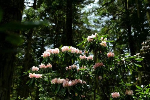 羊角花是一種非常頑強(qiáng)而耐寒的植物。她在高寒陰濕和高山草甸生長,最小的只有幾厘米高,最大的有幾丈高,且根系發(fā)達(dá)、枝繁葉茂,它的花有紅、紫、黃、白等多種,畢棚溝的杜鵑主要是白色和粉色的。白色是一種清爽的白、高貴的白,花瓣像喇叭一樣綻開,粉紅的花蕊色彩柔和、淡雅,不很張揚(yáng),文靜得像閨中的乖女,不含一絲嫵媚。