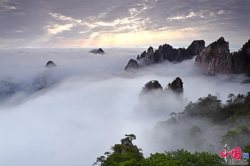 五月的黃山也是黃山云海容易出現(xiàn)的季節(jié),這時(shí)黃山山上正處在季節(jié)交替時(shí)期,南北冷暖氣流交匯比較明顯,云海出現(xiàn)時(shí),煙云聚集,初時(shí)冉冉上升,裊裊如篆,漸漸凝聚,成團(tuán)成片;接著迅速?gòu)浡?,頃刻間匯成白云滾滾,銀浪滔滔,浩瀚無(wú)際的“海洋”。