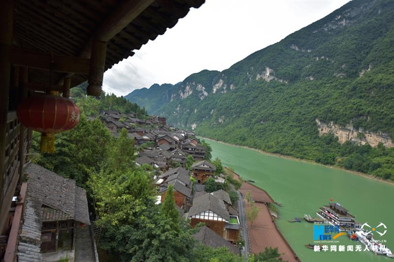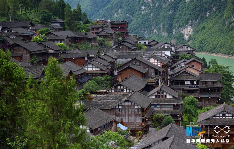 從空中俯瞰龔灘古鎮(zhèn),古老的建筑群沿著一江碧水蜿蜒,靜靜屹立在烏江邊上。古樸的建筑與青山綠水化為一體,猶如一幅天然畫卷。新華網(wǎng)發(fā)(陳碧生 攝)