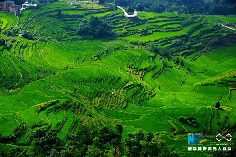 菖蒲大草原位于重慶市酉陽縣菖蒲蓋山脈,面積約100平方公里。盛夏時節(jié),草原披綠,牛羊成群,在山城重慶就能體驗“風(fēng)吹草低見牛羊”的美麗盛景。圖為草原邊緣的花田萬畝梯田。新華網(wǎng)發(fā)(陳碧生 攝)