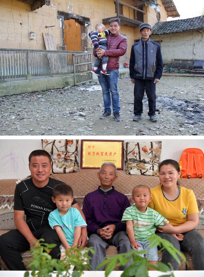 上圖:在江西,村民胡尚海抱著兒子和父親在舊屋前合影(2017年11月攝,資料照片)。下圖:胡尚海一家在安置點(diǎn)的住房?jī)?nèi)合影(5月21日攝,新華社記者 彭昭之 攝)