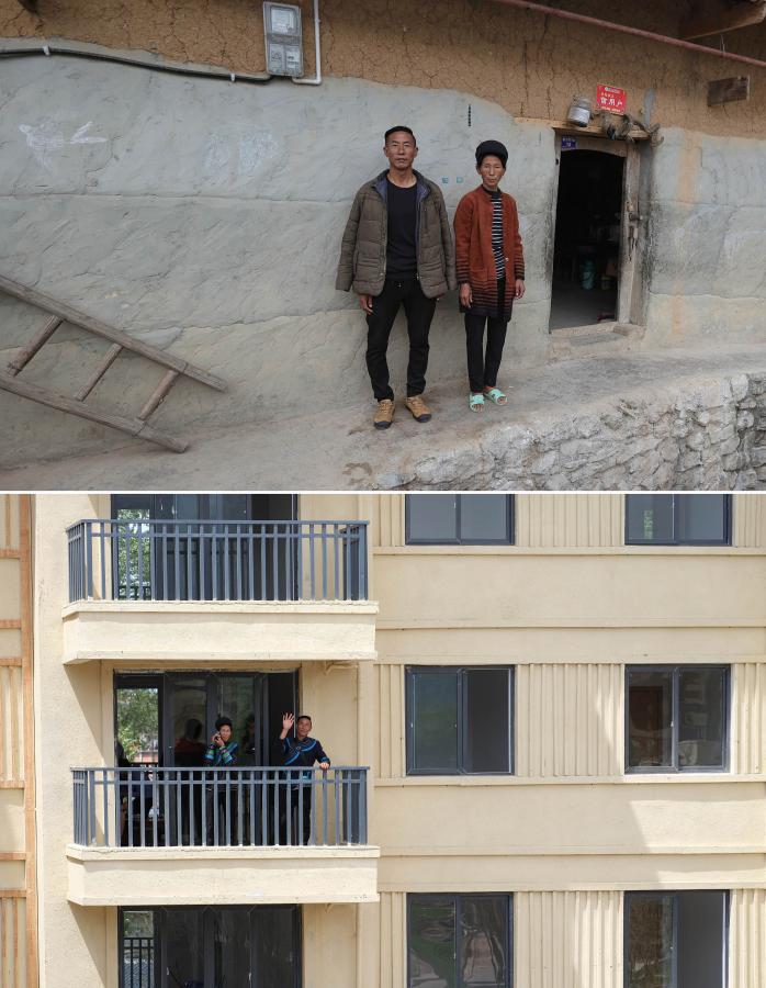 上圖為四川省昭覺縣阿土列爾村村民某色達(dá)體夫婦在“懸崖村”的家門口拍照留念(5月13日攝);下圖為某色達(dá)體夫婦在昭覺縣城易地扶貧搬遷安置點(diǎn)南坪社區(qū)新家的陽臺(tái)上揮手(5月13日攝)。新華社記者 江宏景 攝