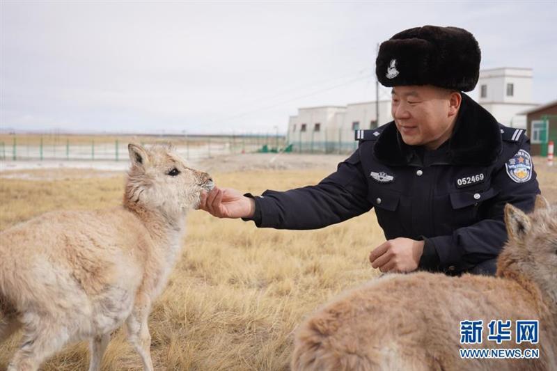 12月7日,可可西里索南達(dá)杰保護(hù)站站長(zhǎng)趙新錄在撫摸藏羚羊幼仔。