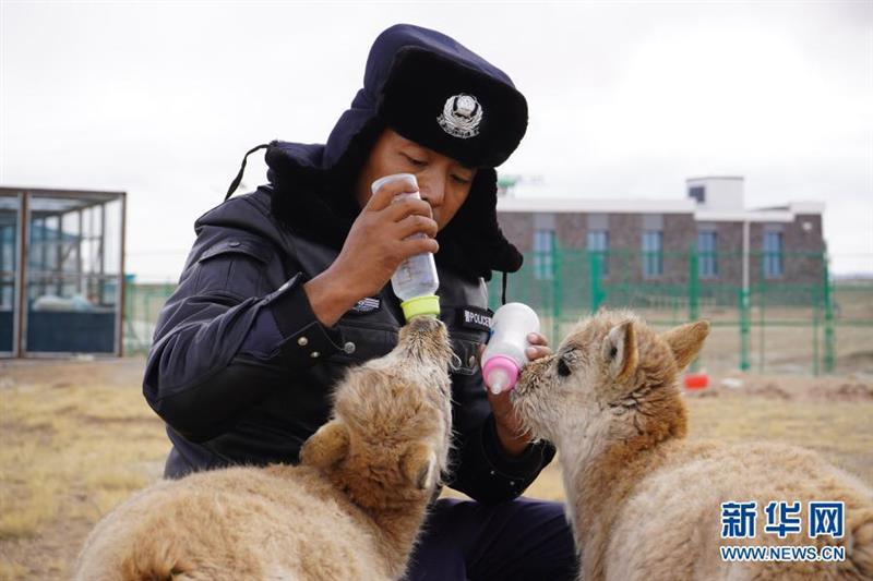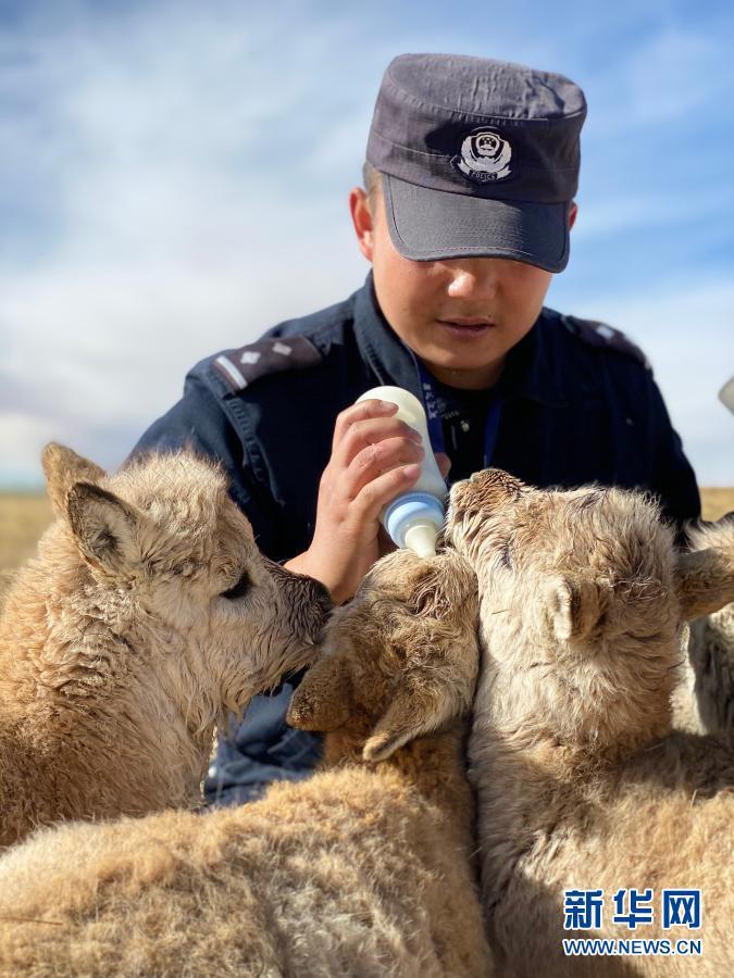 12月7日,可可西里巡山隊(duì)員達(dá)才在給藏羚羊幼仔喂奶。