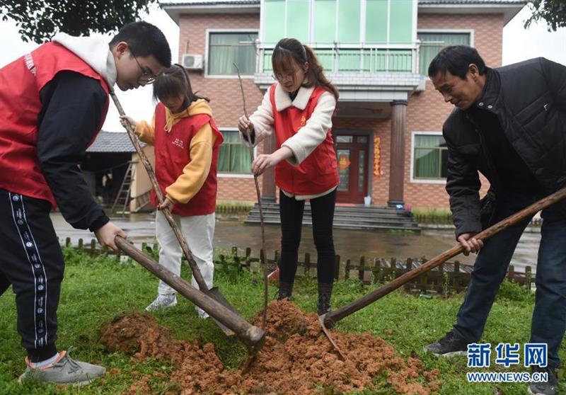 3月20日,志愿者吳科寰(左一)在諸暨市次塢鎮(zhèn)吳高塢村農(nóng)民吳正燦(右一)家庭院內(nèi)栽下一棵無花果樹。