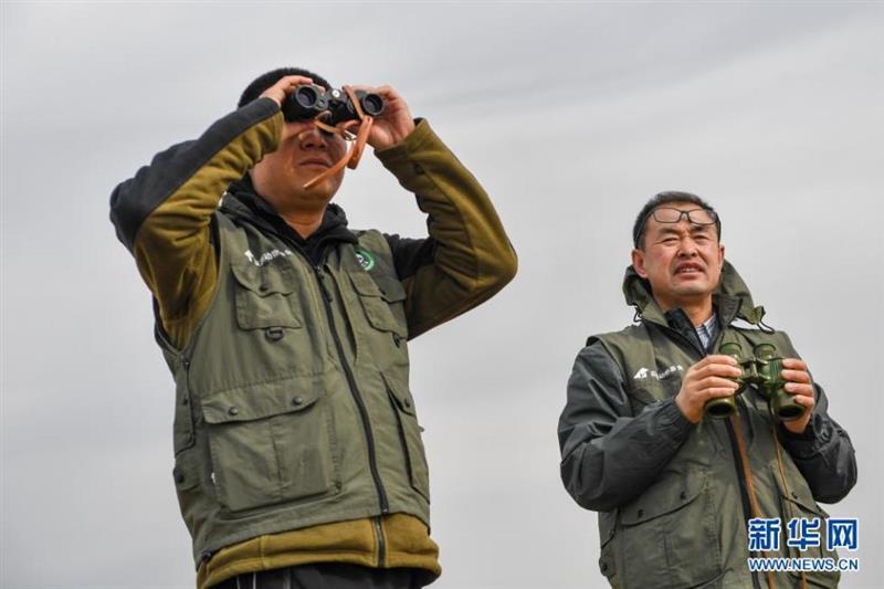 3月31日,在白城市鎮(zhèn)賚縣,護飛隊員在野外觀察候鳥活動情況。新華社記者 張楠 攝