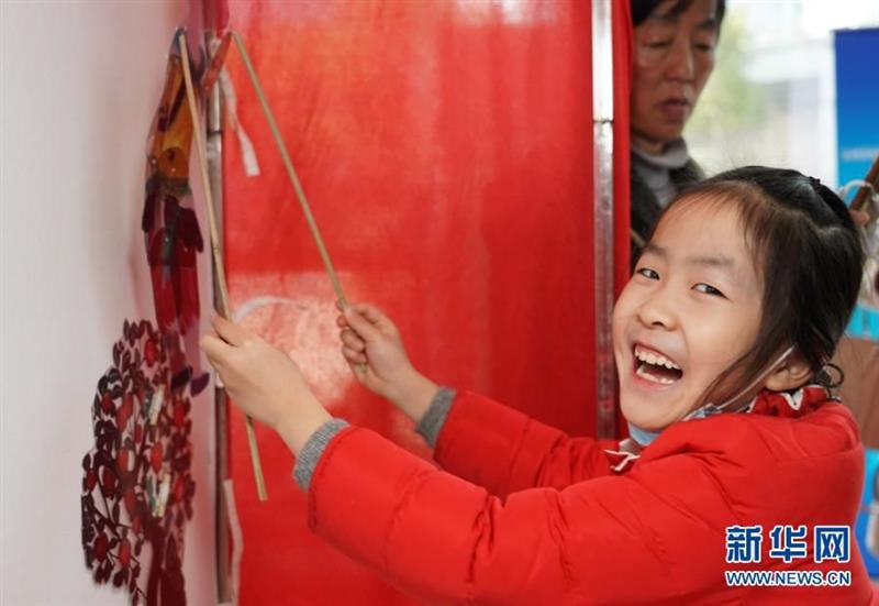 1月30日,一名女孩在學(xué)習(xí)皮影戲表演。新華社記者 任瓏 攝