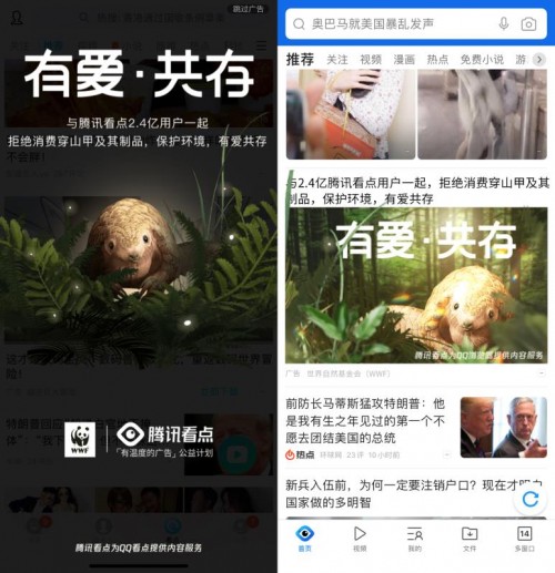世界自然基金會(WWF)是全球最大的獨(dú)立性非政府環(huán)境保護(hù)組織之一。騰訊看點(diǎn)是騰訊公司全新推出的信息流內(nèi)容服務(wù)。此次雙方合作上線穿山甲保護(hù)活動,將公益與廣告營銷結(jié)合,對日后的商業(yè)化合作具有重要意義。