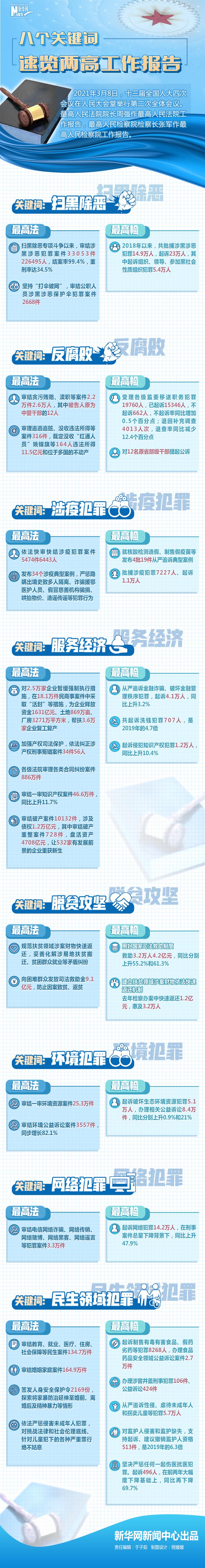 8日提請十三屆全國人大四次會議審議的兩高報告,交出一份滿滿的成績單。掃黑除惡“打傘破網(wǎng)”、嚴懲腐敗守護平安、加強民生司法保障……一串串數(shù)字勾勒出法治中國建設的亮點。