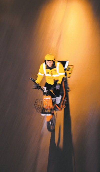 重慶街頭,網(wǎng)約配送員在送餐途中。 |