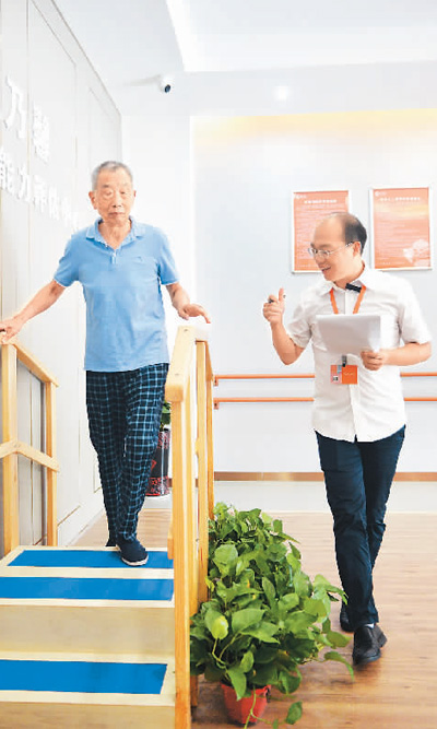 在湖南長沙康乃馨老年呵護中心,老年人能力評估師王帝權(quán)(右)為一名老人做生活自理能力評估。 |