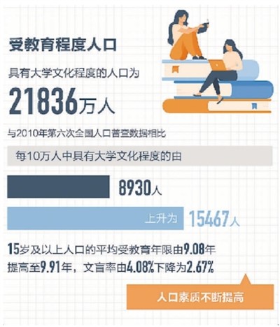 ——?jiǎng)趧?dòng)年齡人口中,高中及以上受教育程度的人口占比43.79%,比“六人普”提高了12.8個(gè)百分點(diǎn)