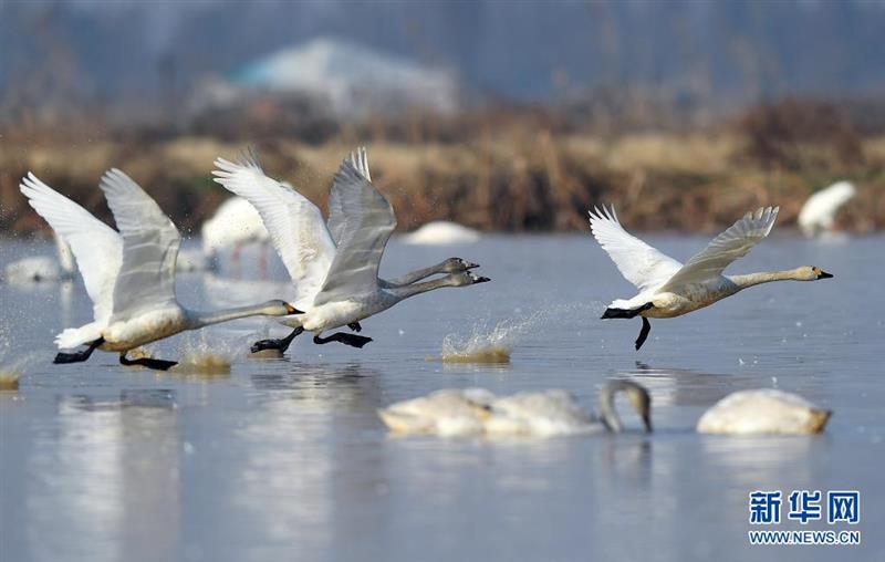 候鳥在位于江西鄱陽湖畔的五星農(nóng)場境內(nèi)振翅起飛(2018年1月11日攝)。新華社記者 萬象 攝