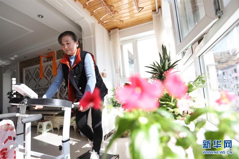 在青海省海東市平安區(qū)三合鎮(zhèn)的易地搬遷集中安置區(qū),翻身村村民牟落毛吉在家中的跑步機(jī)上鍛煉身體(2021年2月5日攝)。新華社記者 吳剛 攝