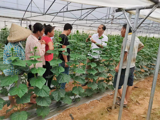 鄉(xiāng)村科技特派員唐小付(右二)給種植戶提供技術(shù)指導(dǎo)。受訪者供圖