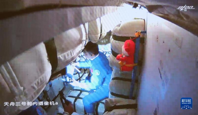 10月17日在北京航天飛行控制中心拍攝的神舟十三號(hào)航天員乘組進(jìn)入天舟三號(hào)貨運(yùn)飛船的畫面。新華社發(fā)(趙玉良 攝)