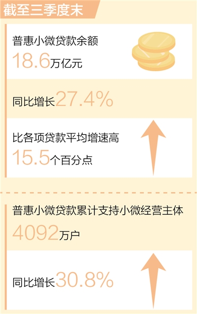 中國(guó)人民銀行發(fā)布的最新數(shù)據(jù)顯示,截至三季度末,我國(guó)普惠小微貸款余額18.6萬(wàn)億元,同比增長(zhǎng)27.4%,比各項(xiàng)貸款平均增速高15.5個(gè)百分點(diǎn)。普惠小微貸款維持較高的增長(zhǎng)態(tài)勢(shì),繼續(xù)保持量增、面擴(kuò)、價(jià)降、結(jié)構(gòu)優(yōu)化的特點(diǎn)。