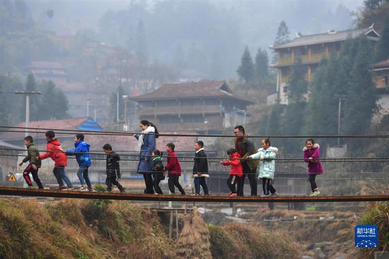 在位于廣西融水苗族自治縣和貴州省從江縣交界的烏英苗寨,鄭昌昊(右三)和妻子吳晗(左五)帶著孩子們玩耍(2021年1月30日攝)。鄭昌昊是廣西柳州市委宣傳部干部,曾于2020年4月至2021年5月在烏英苗寨擔(dān)任駐村工作隊隊員,吳晗曾多次到烏英苗寨教學(xué)點支教。新華社記者 黃孝邦 攝