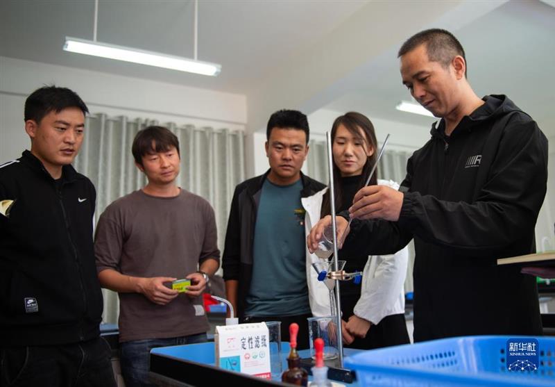 北京市援青支教教師、來自通州區(qū)陸辛莊學(xué)校的化學(xué)教師祁生貴(右一)在青海省玉樹州第四民族高級中學(xué)指導(dǎo)學(xué)校教師進(jìn)行實驗教學(xué)(2020年8月12日攝)。新華社記者 陳鐘昊 攝