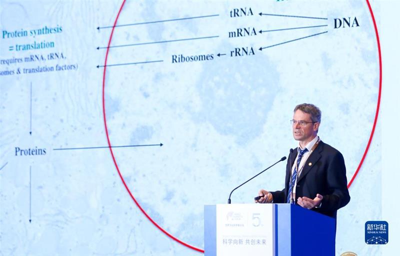 11月6日,2022年世界頂尖科學(xué)家協(xié)會(huì)獎(jiǎng)“生命科學(xué)或醫(yī)學(xué)獎(jiǎng)”得主、德國生物化學(xué)家迪爾克·格爾利希在開幕式上發(fā)表演講。新華社發(fā)