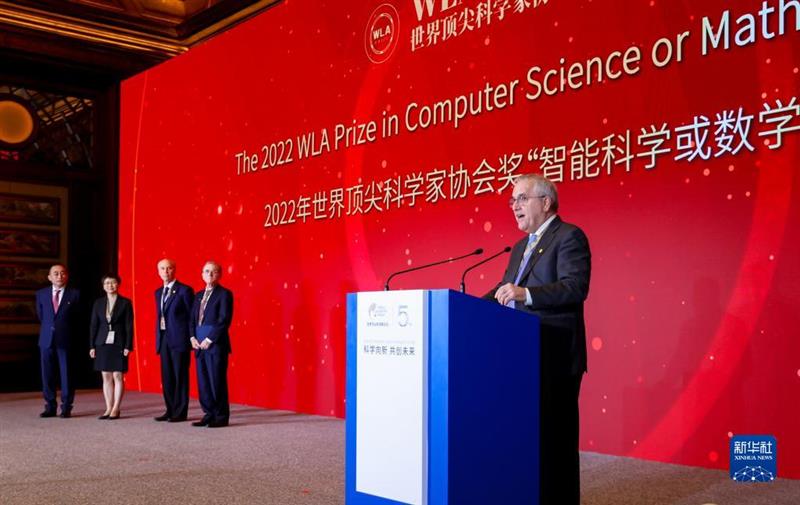 11月6日,2022年世界頂尖科學(xué)家協(xié)會(huì)獎(jiǎng)“智能科學(xué)或數(shù)學(xué)獎(jiǎng)”得主、美國計(jì)算機(jī)科學(xué)與統(tǒng)計(jì)學(xué)家邁克爾·I·喬丹(右一)在頒獎(jiǎng)典禮上致辭。新華社發(fā)