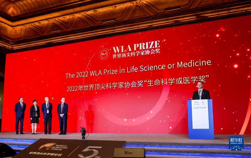 11月6日,2022年世界頂尖科學(xué)家協(xié)會(huì)獎(jiǎng)“生命科學(xué)或醫(yī)學(xué)獎(jiǎng)”得主、德國生物化學(xué)家迪爾克·格爾利希(右一)在頒獎(jiǎng)典禮上致辭。新華社發(fā)