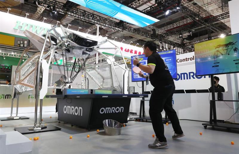 11月5日,工作人員(右)在第六屆進博會上展示歐姆龍公司展出的第八代FORPHEUS乒乓球教練機器人。新華社記者 方喆 攝