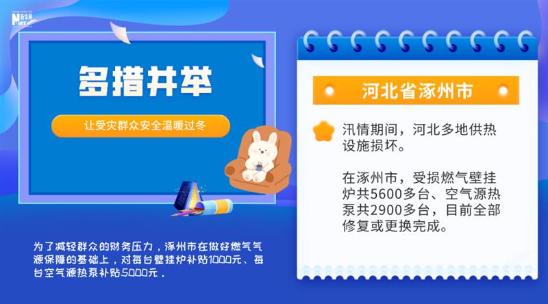汛情期間,河北多地供熱設(shè)施損壞。在涿州市,受損燃?xì)獗趻鞝t共5600多臺(tái)、空氣源熱泵共2900多臺(tái),目前全部修復(fù)或更換完成。為了減輕群眾的財(cái)務(wù)壓力,涿州市在做好燃?xì)鈿庠幢U系幕A(chǔ)上,對(duì)每臺(tái)壁掛爐補(bǔ)貼1000元、每臺(tái)空氣源熱泵補(bǔ)貼5000元。在河北保定淶水縣,10個(gè)位于山區(qū)、丘陵的鄉(xiāng)鎮(zhèn)今冬要使用潔凈煤取暖,預(yù)計(jì)使用量在5.1萬(wàn)噸左右。淶水縣督促相關(guān)企業(yè),早謀劃、早對(duì)接、早儲(chǔ)備,組織車輛加快配送,確保供得上、供得及時(shí)。