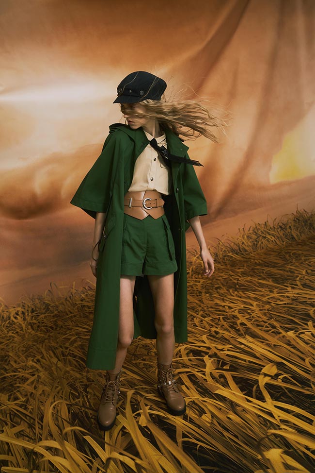 本季的輪廓以利落的中性樣貌為出發(fā),帶有軍裝風格的正裝搭配寬松的縮口褲或穿插大口袋短褲、連身泳衣與競速褲混搭透膚長裙增加律動感,搭配上以刺繡、印花、網(wǎng)紗演繹的窄版領(lǐng)帶,收斂女性溫婉氣質(zhì),造型上搭配從騎馬裝束延伸而成的皮革腰封以及棉質(zhì)馬甲強調(diào)腰部曲線,性感魅力不減,并展露獨立自主的直率氣息。