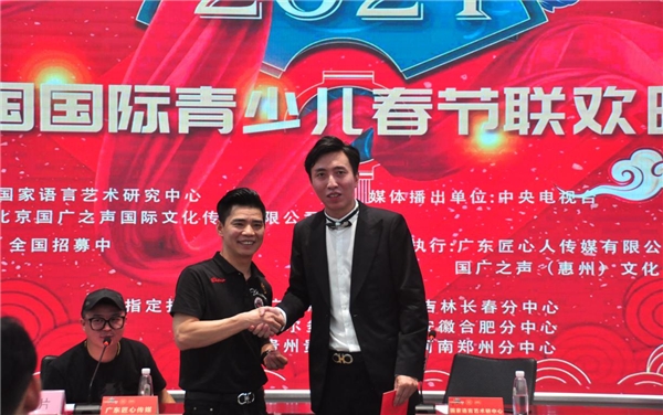 2020年10月9號(hào),由國(guó)家語(yǔ)言藝術(shù)研究中心主辦的2021中國(guó)國(guó)際青少兒春節(jié)聯(lián)歡晚會(huì)廣東惠州簽約儀式,在惠州市匠心傳媒正式簽約,并在惠州市開(kāi)啟個(gè)人節(jié)目征選活動(dòng)?;葜莩修k方:廣東星概念文化傳媒有限公司,創(chuàng)始人繆冉先生(貓王老師)與中國(guó)國(guó)際青少兒春晚總制片人,著名音樂(lè)制作人喬海清進(jìn)行承辦簽約。