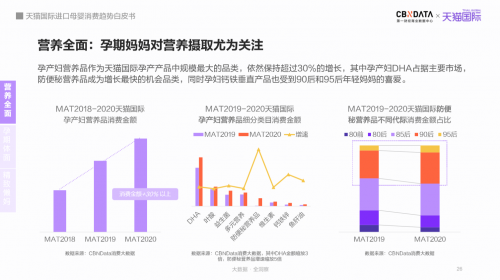 孕期的營養(yǎng)攝取成消費熱點。2020年,天貓國際進口孕產(chǎn)婦營養(yǎng)品消費金額增長30%以上,在多種細分營養(yǎng)品類目中,DHA需求最廣,占據(jù)主要消費規(guī)模;防便秘營養(yǎng)品受年輕孕婦媽媽喜愛,在營養(yǎng)品消費中增速最快。