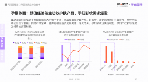 CBNData《報告》顯示,近三年孕產(chǎn)婦相關用品消費金額和消費人數(shù)均持續(xù)高速增長,孕婦營養(yǎng)品消費規(guī)模領先于其他類別。年輕媽媽們追求精致,帶來孕產(chǎn)婦護膚、彩妝產(chǎn)品與產(chǎn)后修復儀器消費的高速增長。