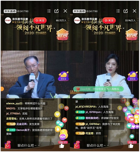 兩個小時的直播活動中,嘉賓們除了推介優(yōu)秀文學(xué)作品,還回答了眾多讀者和網(wǎng)友關(guān)注的問題,如,如果回到20歲你會給自己什么閱讀建議?讀屏?xí)r代如何處理淺閱讀與深閱讀?五位嘉賓圍繞這些話題熱烈討論,不斷碰撞出智慧的火花。當(dāng)晚在京東直播間與新華云直播內(nèi),有近500萬人次在線觀看。觀看人次,分別創(chuàng)下京東直播和新華云直播同類直播活動新高!