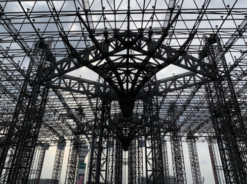 三期項目T4航站樓總建筑面積67萬㎡,主體由框架混凝土+鋼結構組成,其中航站樓鋼結構屋蓋共分為五個提升分區(qū)累積提升,共計11.4萬㎡,重約3.1萬t,在國內(nèi)鋼結構工程施工中位于前列。為實現(xiàn)鋼結構如期完成施工任務,項目部一方面科學組織,通過合理安排搭接施工,作業(yè)人員兩班倒等保證作業(yè)進度;另一方面克服大型超重異型分叉節(jié)點加工制作、樓面上水平運輸難題以及大集群液壓提升系統(tǒng)同步性控制等關鍵難題。在疫情期間,針對工人返崗困難,交通不便等問題,項目部采取了分批分次少量復工的方式方法,逐步達到施工高峰,現(xiàn)有人數(shù)達到5000人,其中鋼結構作業(yè)人員580人。