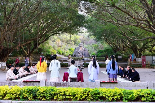 活動(dòng)當(dāng)天上午,在清源山老君巖廣場(chǎng)前還舉行了莊嚴(yán)的請(qǐng)茶儀式。感德茶館八家入駐茶企、感德茶師傅行盥洗禮入座,由泉州漢服天下帶來(lái)請(qǐng)茶舞表演,現(xiàn)場(chǎng)品樂(lè)賞藝,同賞茶舞?!案械虏鑾煟妓嚦?;匠心傳承,更勇?lián)?dāng)…”隨后,八位感德茶師傅列隊(duì)整齊,在老君巖前莊重地吟誦《感德茶師傅宣言》。吟誦完畢,感德茶館八家茶企代表、八位感德茶師傅舉起手中的茶杯,依次向老君奉茶。